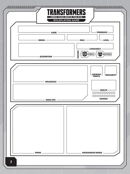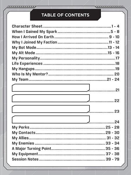 The Transformers Roleplaying Game Character Journal is an excellent resource that help players fully customize and develop their individual characters. The journal features not only expanded characters sheets, but much, much more. The majority of the journal is rich with prompts and writing hooks to assist in creating your version of the perfect character!