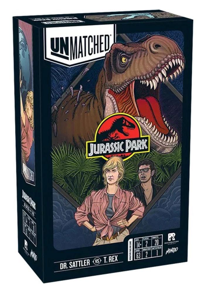 Unmatched är ett snabbspelat, assymetriskt och kortstyrt figurstridsspel. Varje låda är fristående och kan kombineras med andra. Hjältarnas unika kortlekar återger deras karaktäristiska stil och krafter. Taktisk förflyttning och ett stridssystem utan slump belönar erfarenhet men reglerna är samtidigt lätta att lära sig. Tyrannosaurus Rex anfaller vildsint och tycks ostoppbar, medan Dr Sattler drar full nytta av miljön runt henne och av Dr Ian Malcolms kaosteori.