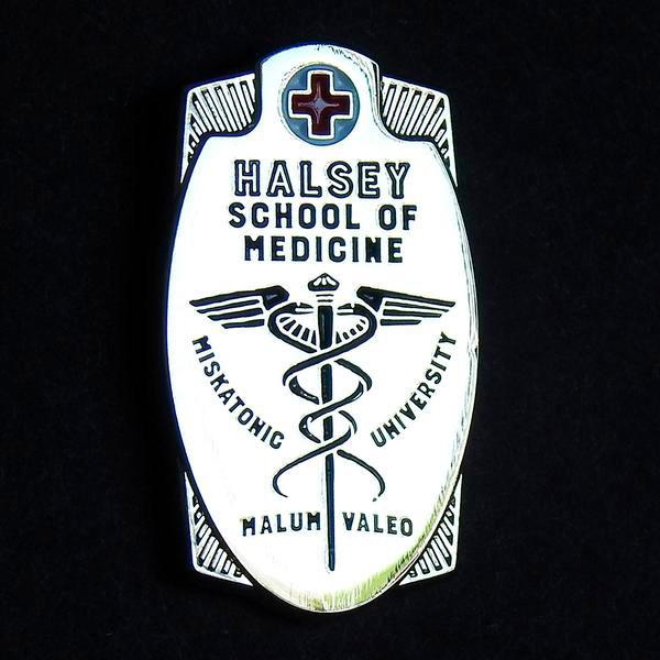 Halsey School of Medicine - for meritorious contributions in the medical arts and sciences. Silver with embossed caduceus and red enamel cross.