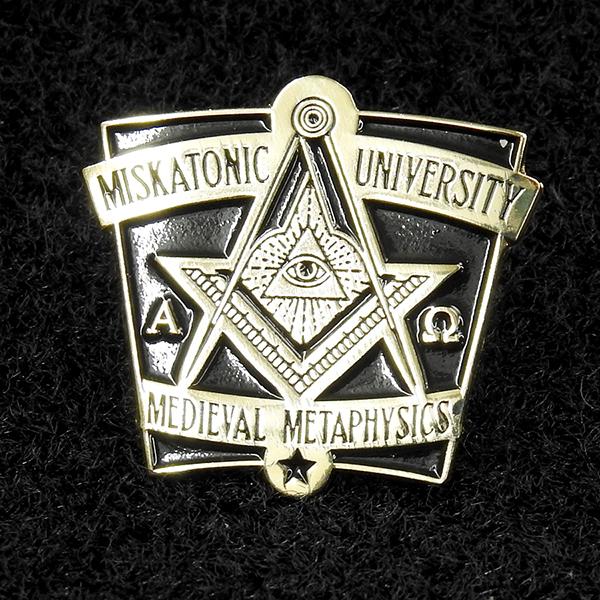 Designed originally to decorate our Miskatonic Varsity Hoodie, our collection of M.U. pins celebrate the many accomplishments of Miskatonic students, RPG gamers and weirdos in general. Mostly, we thought they would be fun. All are enameled metal pins with a pin and traditional butterfly clutch, custom designed by the HPLHS. Medieval Metaphysics - for meritorious scholarship in historical metaphysics and mastering the occult sciences of yore. Polished gold with black enamel.