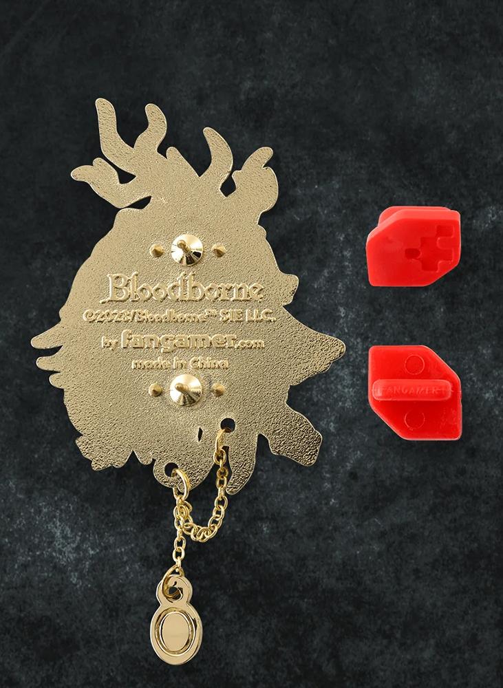 This official Bloodborne hard-enamel pin was designed by Nina Matsumoto and features a two-level design with a small charm hanging from a chain. The pin itself is about 5cm tall.