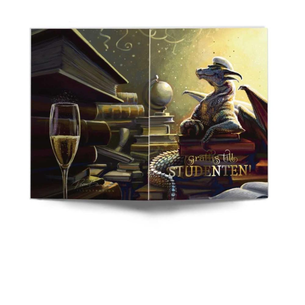 Gratulationskort med en nöjd studentdrake. Kuvert medföljer