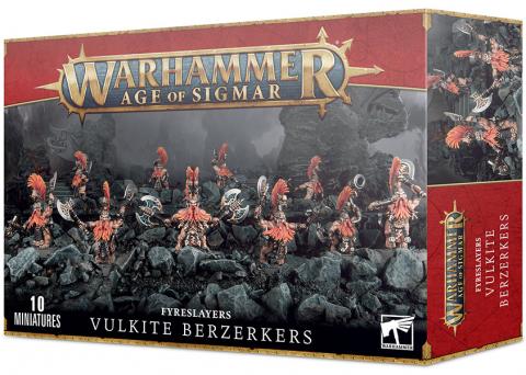 This multi-part plastic kit contains all the components necessary to assemble 10 Vulkite Berzerkers, determined and strong warriors of the Fyreslayers. They come with an impressive selection of weaponry - fyresteel handaxes, war-picks and bladed slingshields - and feature ur-gold runes hammered into their skin. One model can be assembled carrying a Horn of Grimnir, and one warrior can be assembled as a Karl, with ornate fyresteel handaxe or war-pick and his own head options. The kit comes with a whole load of extra ornate runes and keys with which to decorate your Fyreslayers.