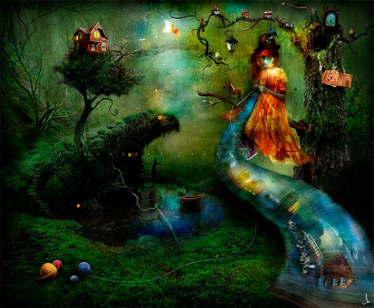 Större formatet: figur i hatt stickar en märklig halsduk. Texten över bilden står inte med på vykortet!