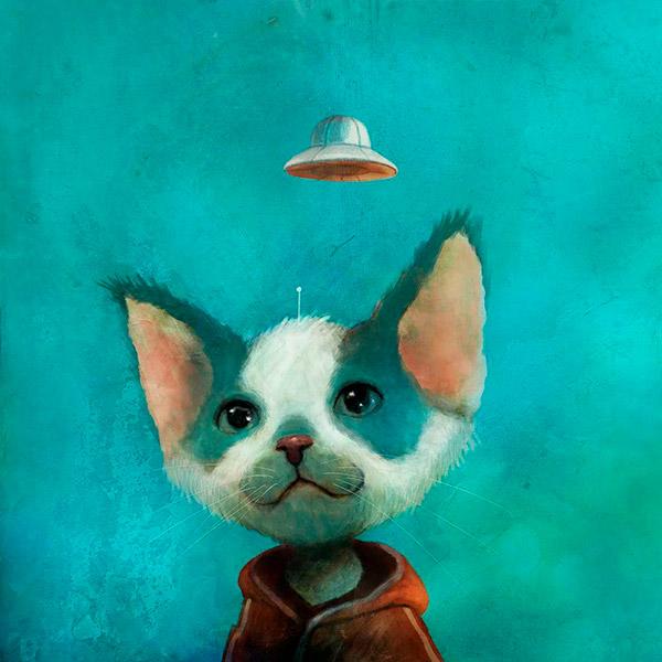 Vykort med kuvert: Motiv: katt mot blå himmel och ett UFO...