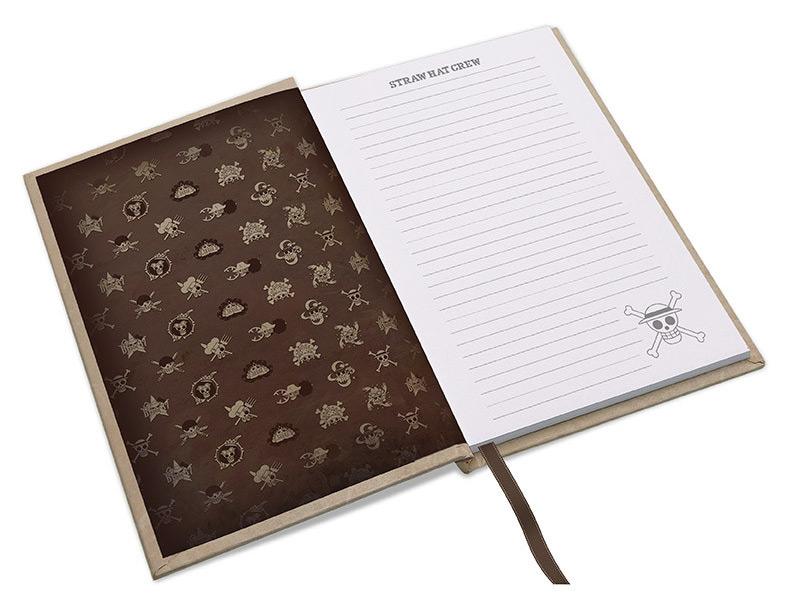 Linjerad anteckningsbok prydd av efterlysning från One Piece.