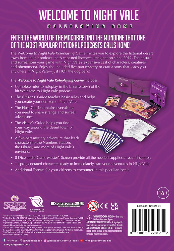 The Welcome to Night Vale Roleplaying Game invites you to explore the fictional desert city from the hit podcast that’s captured listeners’ imagination since 2012. The absurd and surreal join your game with Night Vale’s expansive cast of characters and phenomena. Enjoy the included five-part mystery or craft your story that leads you anywhere in Night Vale—just NOT the dog park!