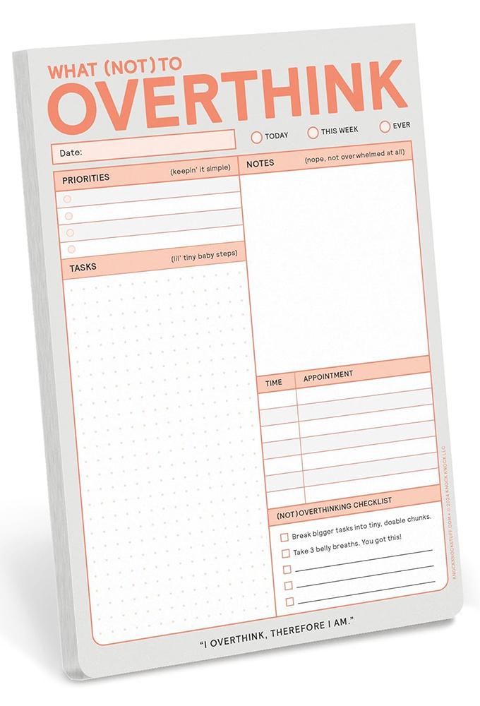 For some of us, feeling overwhelmed is a way of life. This Knock Knock to-do notepad is uniquely structured to help our special brains get focused so we can save our overthinking superpowers for the fun stuff . . . like, should we get curly fries or onion rings with that? Both? Maybe both, with ketchup . . . and ranch?