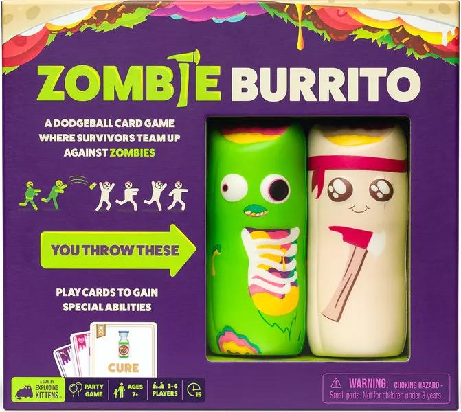 Each game involves two teams, Zombies and Survivors. Pick your side, then work to collect sets of 3 matching cards. Some cards give Survivors special abilities, some help out the Zombies, and some incite an epic battle between the living and the undead. During a battle, it’s up to you and your teammate to knock out your opponents with a squishy Burrito. The first team to win 3 Battles wins the game!