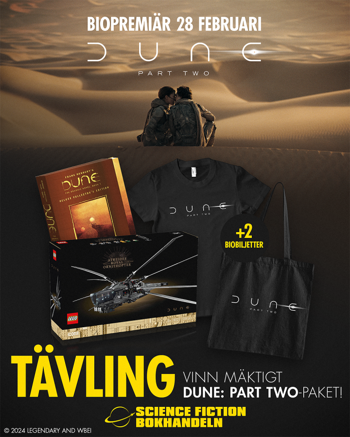 Hur laddar en upp för detta kommande filmsläpp? Med en tävling såklart! Tillsammans med Warner Bros. Pictures Sverige ger vi en person möjlighet att vinna ett påkostat prispaket innehållande bla. 2 st. biobiljetter och det uppmärksammade LEGO-setet Dune Atreides Royal Ornithopter. Tävlingen äger rum på SF-Bokhandelns Instagram och vår jury väljer 1 vinnare på onsdag 21 februari.