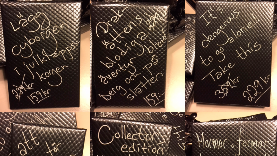 I morgon är det Black Friday - specialprisdagen framför andra. Här på SF-Bokhandeln märker vi om 13 utvalda varor - alla toppenbra julklappar - och sätter ner priset rejält. Extrapriset gäller hela dagen i morgon, i alla tre butikerna och på postorder. Vilka varor det gäller avslöjas i morgon, men en ledtråd ges på paketen: