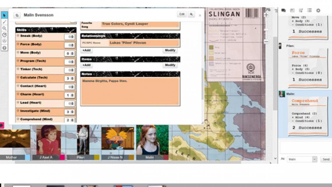 Allt annat, som handouts, kartor, bakgrundsbilder osv, kan laddas upp och förberedas i förväg. Det är lätt att byta mellan olika bakgrunder och fördela det som behöver fördelas mellan spelarna under tiden spelet pågår. Man kan självklart också ha egna karaktärsblad som pdf, ladda upp, och sedan slå virtuella tärningar och tolka resultatet ändå.